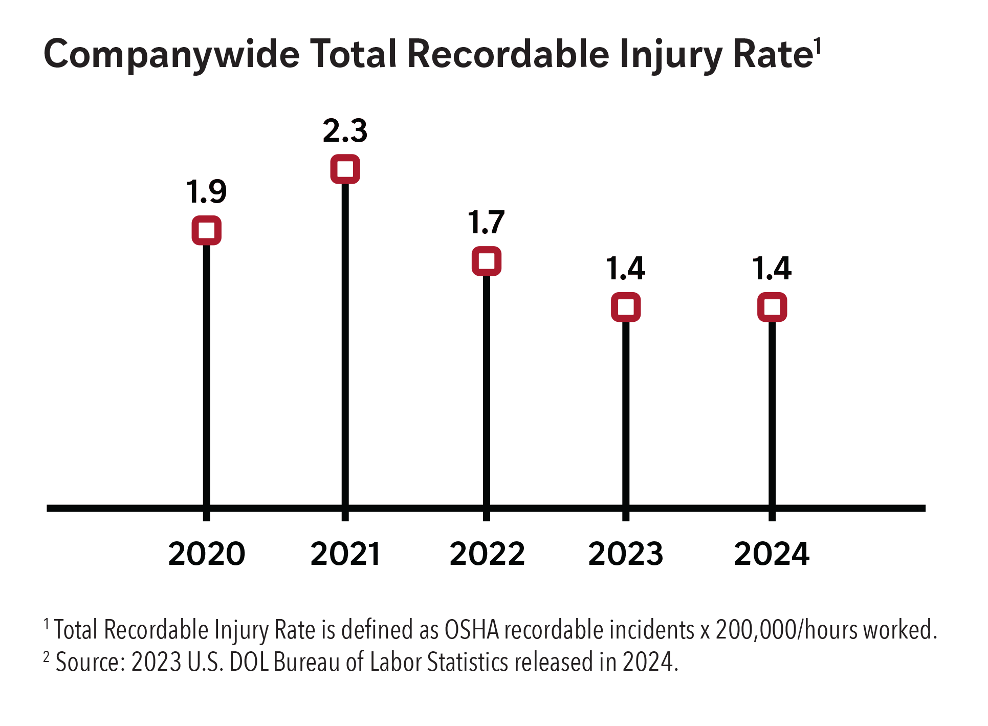 Valuing people includes providing a safe and healthy work environment and creating a culture of safety that extends beyond the workplace, into our homes and communities. Safety is, and always will be, our primary focus and core value. We intend for each individual to arrive at the workplace and return home safely each day—without accident or injury. This is achievable when we all work together. It requires commitment from leadership and team members at every level to take ownership and responsibility for their safety and the safety of others.
